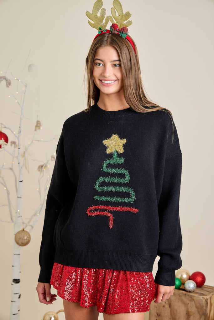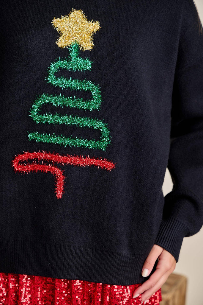 Celebrate the season in style with this eye-catching Tinsel Christmas Tree Knit Sweater. The luxe black knit showcases an intricately embroidered Christmas tree adorned with shimmering tinsel details and crowned with a gleaming golden star. Effortlessly chic and instantly festive, this pullover pairs beautifully with everything in your holiday wardrobe. In stock and ready to ship, it's the perfect last-minute gift or personal treat for spreading Christmas sparkle all season long.