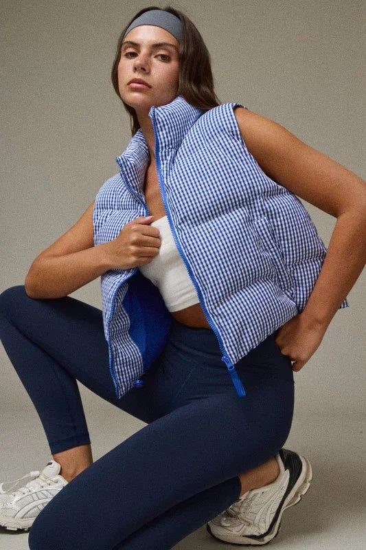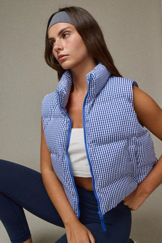 Elevate your layering game with this striking gingham puffer jacket. The cropped silhouette and classic black-and-white print deliver understated sophistication, while the lightweight construction provides warmth without bulk—ideal for unpredictable seasons. A stand-up collar and full zip front ensure comfort and versatility. Whether styled over a dress for polished edge, paired with high-waisted bottoms, or worn casually with denim, this piece seamlessly transitions from day to evening. True to size, it's the refined essential every wardrobe deserves.
