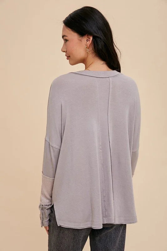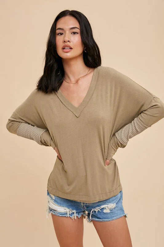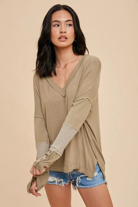 Elevate your everyday wardrobe with this refined long sleeve V-neck tee. Crafted from a luxuriously soft blend of rayon, cotton, polyester, and spandex, it features distinctive contrast waffle knit panels and raw hems for an effortlessly polished look. The button-up sleeves add versatile styling options, while the thoughtfully designed fabric composition ensures comfort and durability. Available in sophisticated olive and gray tones, this piece transitions seamlessly from casual to dressed-up occasions.