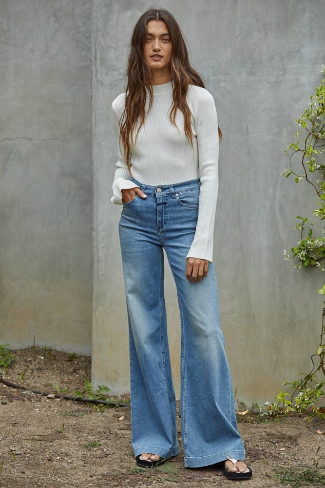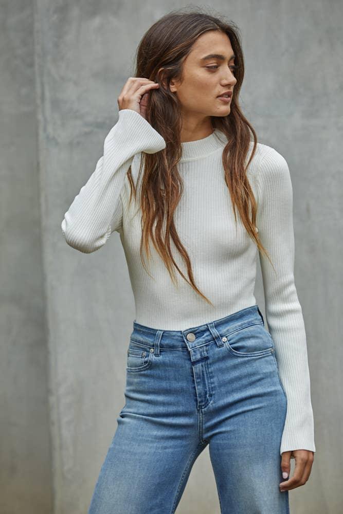 Experience comfort and style with this Rib Mock Neck Long Sleeve Top, crafted from a soft knit blend of acrylic and nylon for a snug and flattering fit.